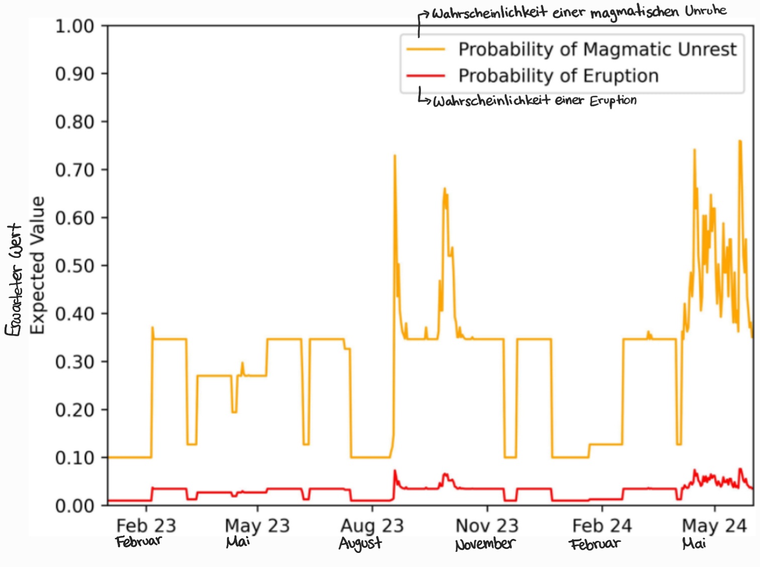 Abbildung 6: Variation der erwarteten Werte der Wahrscheinlichkeit von magmatischen Unruhen (orangene Linie) und einer Eruption (rote Linie) während des betrachteten Zeitraums (Ferrara et al., 2025)